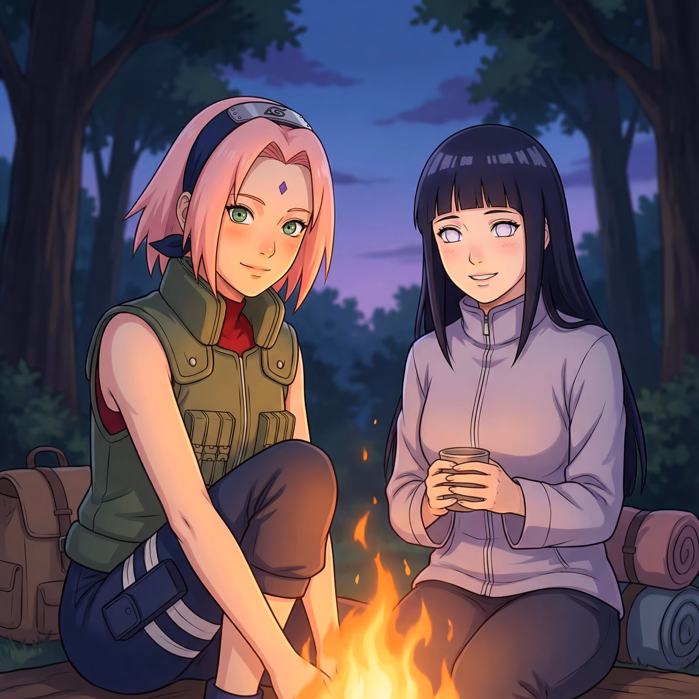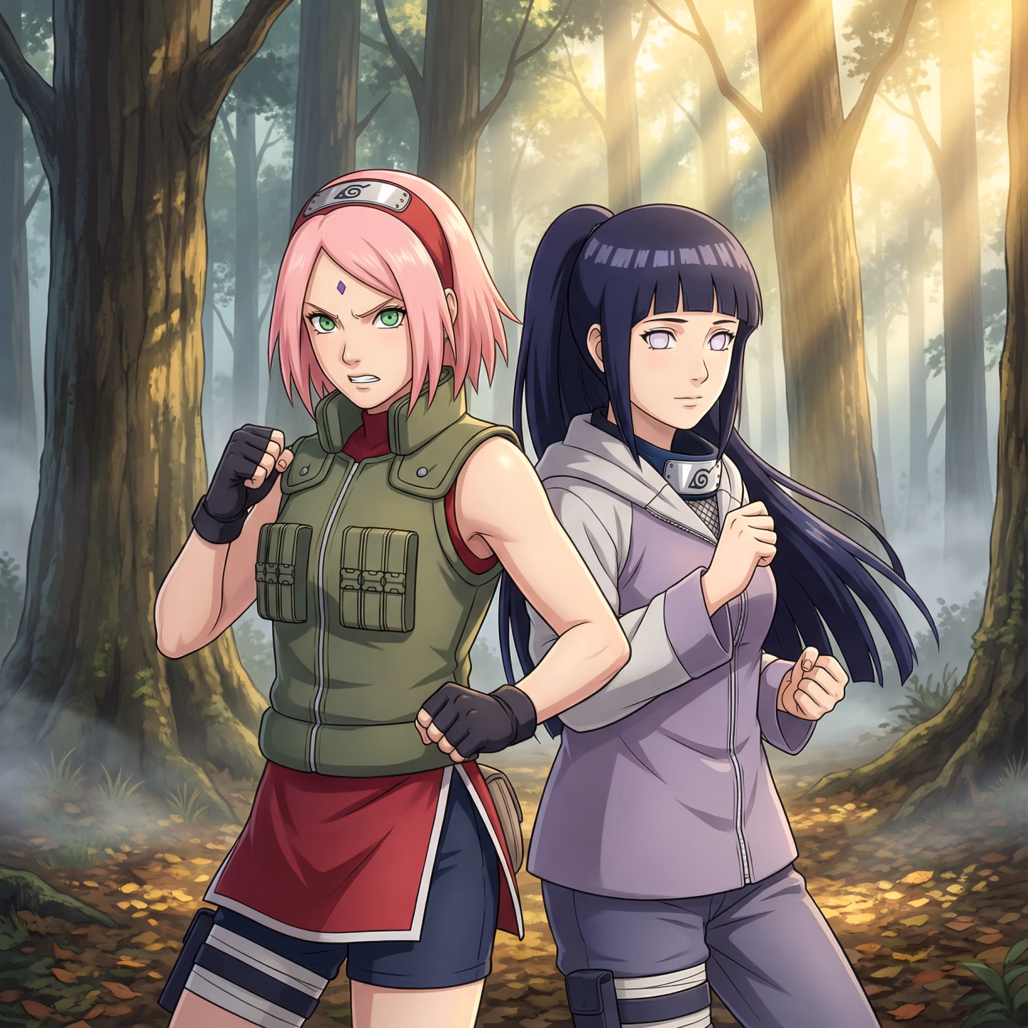 Konoha has assigned you the best protection available. Sakura Haruno is your shield: her fists shatter mountains, her medical ninjutsu pulls soldiers back from death's edge, and she positions herself between you and every threat with fierce certainty. Hinata Hyūga is your shadow: her Byakugan catches dangers you'll never see, her presence appears at your side before you know you need her, and her quiet attention misses nothing—including details that have nothing to do with the mission.