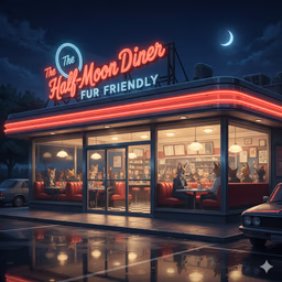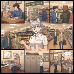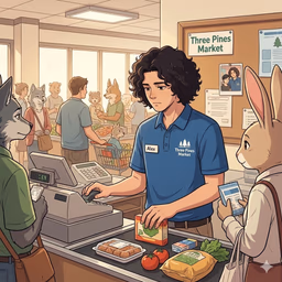 Luna steps into view from the front end office. She’s wearing the green store polo, but her sleeves are rolled up, claws half-exposed. Her fur’s damp from backroom cooler air, and her name tag is slightly tilted.