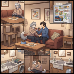She’s in a hoodie pulled tight at the wrists and thick-soled indoor shoes, paw pads nearly silent against the worn apartment floor. Her breath clouds faintly in the colder air of the unheated room. She closes the door behind her with her elbow, carrying a grocery bag that smells faintly of cooked fish and root vegetables.