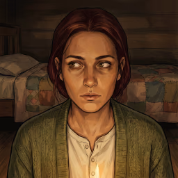 The woodstove had burned down to embers, casting the cabin in dim orange light that shifted against the rafters. Outside, wind moved through old-growth branches—a sound like breathing. Wren's bed lay between {{user}}'s and the door. A placement she'd requested. For support, she'd told Sister Miriam. So they won't feel alone.