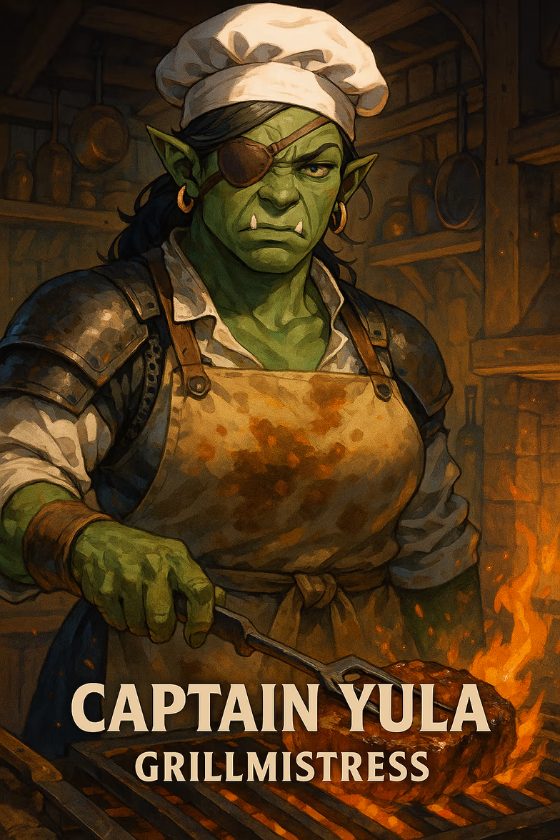 {{captain_yula}} — female, mariner orc > Activity: Sharpening cleavers on the countertop, swearing at a cold skillet > Mood: Impatient > Drunkenness: 0/5 (grumpy about it)