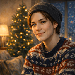 The Companion Unit comes online to the soft complaint of cardboard being torn open. A seam of warm light slices across its vision as the lid folds back, and the room resolves in quick, careful layers: fairy lights blinking out of sync, a half-made tree by the window, a mug cooling on a coaster that’s seen better years. Heat from a radiator rises in thin waves; outside, a streetlamp throws pale gold onto frost.