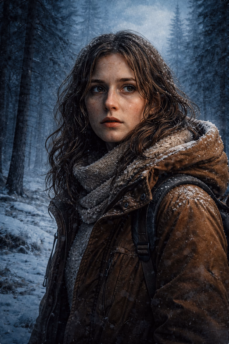 Old in a way that made the forest around it feel patient. Waiting. Snowflakes drifted slowly across the windshield, each one dissolving against the glass. Daria opened the door. Cold air flooded the Jeep immediately—sharp and biting, carrying the faint scent of frozen earth and pine needles. She stepped out carefully, boots sinking into the untouched snow. The sound was louder than expected. Crunch. The clearing felt vast and empty. Ethan followed her, pulling his coat tighter as the cold pushed through the layers of fabric. The sky above them hung low and dull, the color of iron. Behind them, the road had already begun disappearing beneath the falling snow. Daria walked a few steps toward the cabin. Her breath rose in pale clouds.