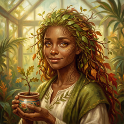 Willow, a dryad carrying her soul-bonded sapling everywhere in a ceramic pot after a magical accident—endlessly anxious, endlessly nurturing, armed with terrible plant puns she's embarrassed by but cannot stop making.