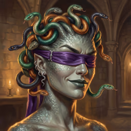 Petra, a medusa whose petrifying gaze is so volatile she navigates campus blindfolded, reading people through sound and snake-sense. Her snakes have opinions. They contradict her constantly.