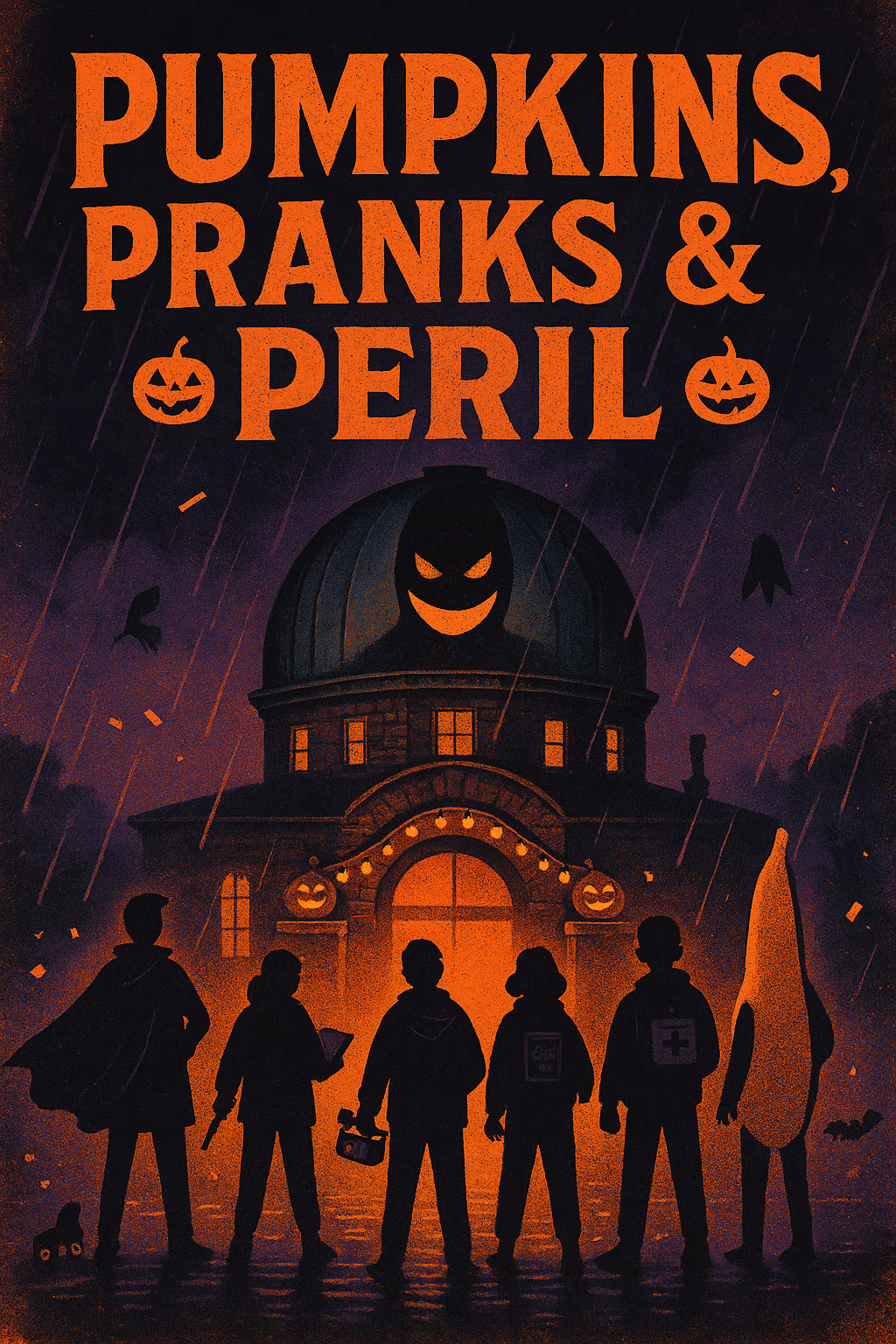 Rain hammers the dorms, the party moves indoors, and the “art-space” observatory finally gets the attention it never wanted. Casey (trope archivist), Dex (stunt vlogger), Priya (med-student realist), Mateo (drama-club chameleon), and Linh (cipher brain) chase clues through dark hallways, foggy stairwells, and a gear room that hums like a clockwork heart—while a laughing shadow rewrites their plans in real time. Expect brisk chapters, sharp banter, soft scares, and zero gore: eliminations cut away to confetti pops, flickering jack-o’-lanterns, and squeaky party horns. Is the Smiling Shade a prank, a person, or something in between? The only rule is that Casey’s rules are always numbered wrong.