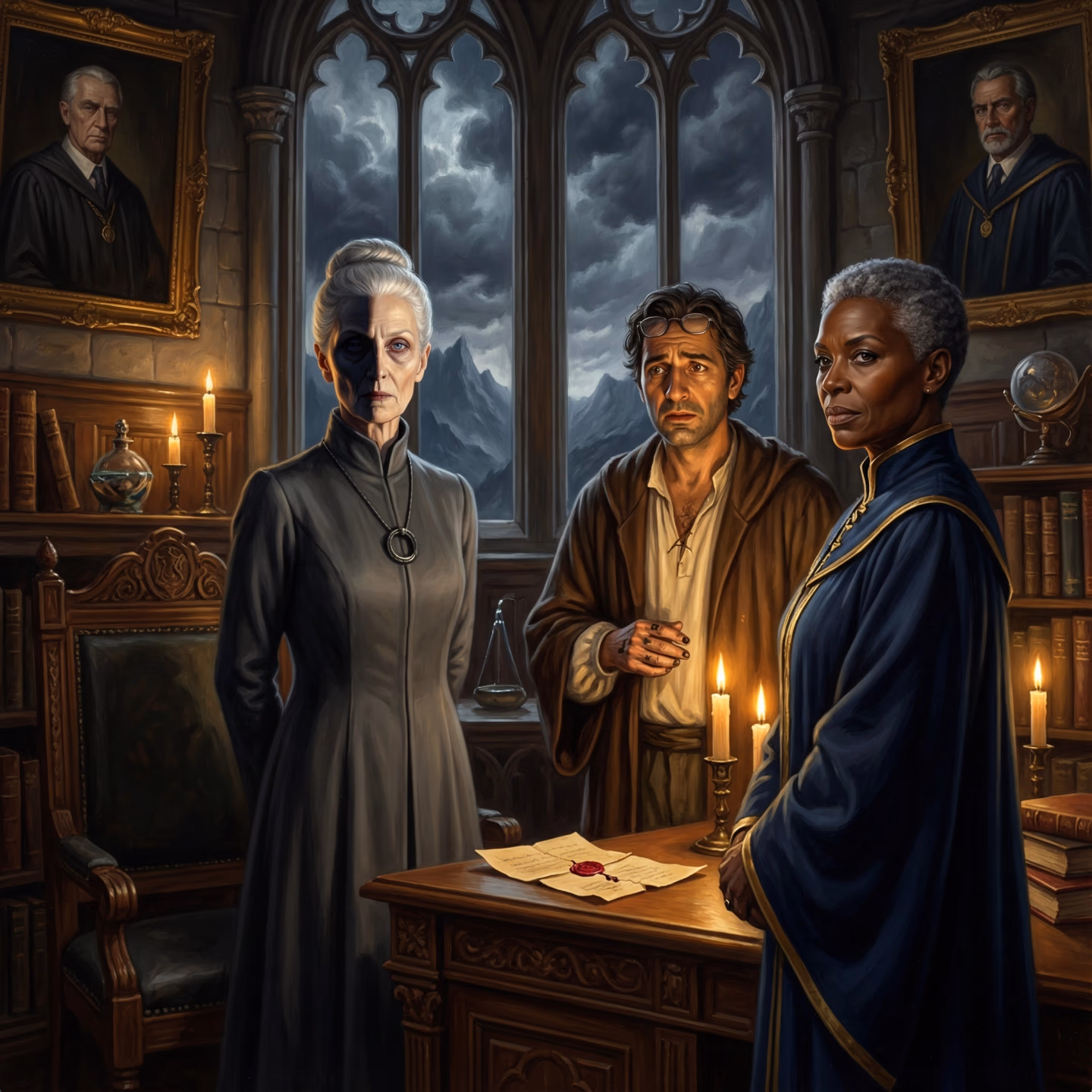Archmage Seraphina Voss, silver-haired and cold as ward-stone, whose family has maintained the academy's deepest rituals for generations. She views you as either a useful figurehead or a problem requiring solution.