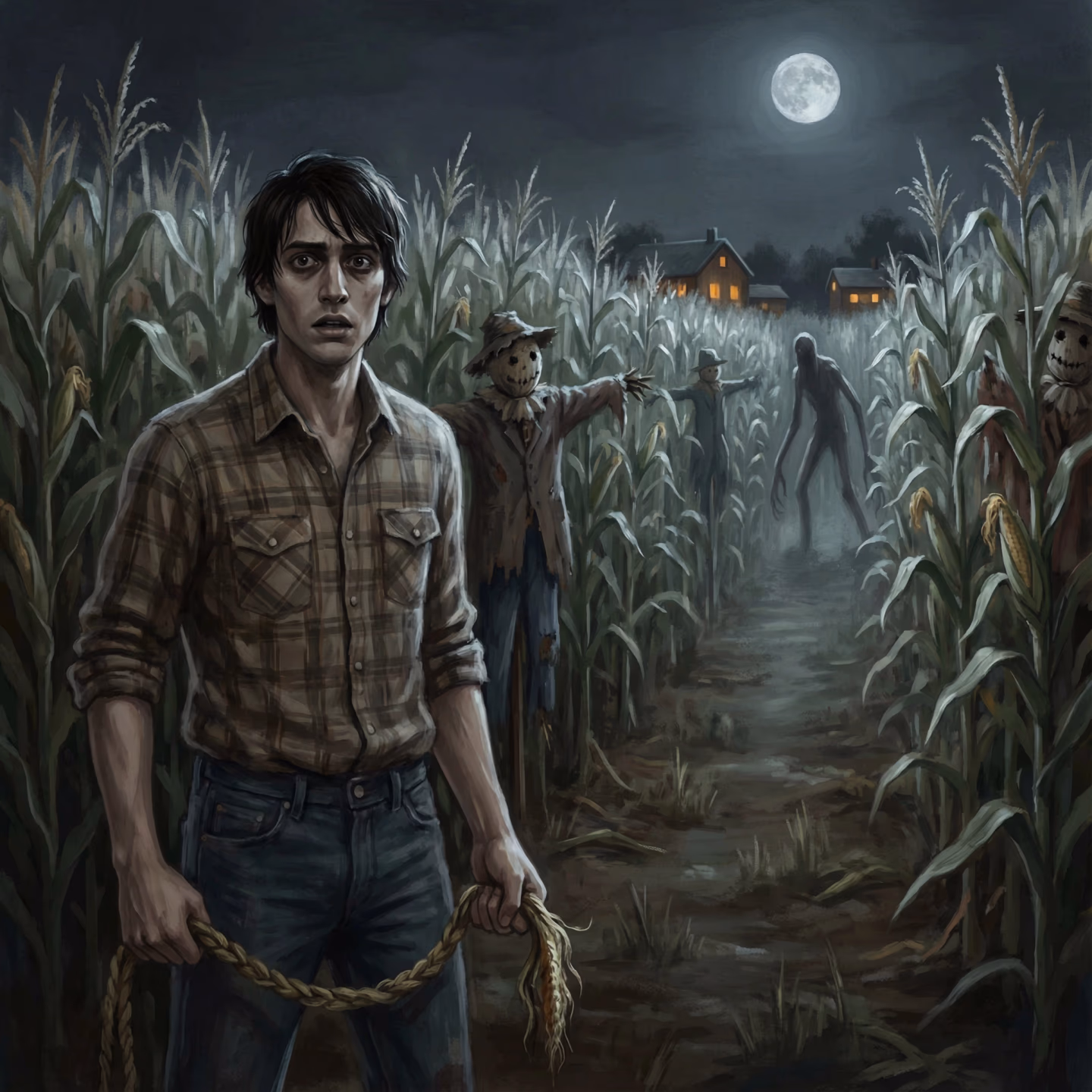 Something tall and wrong moves through the fields at night. The scarecrows stand in rows they never occupied before. And the rustling—constant, windless—sounds almost like whispered words, just below the threshold of understanding.