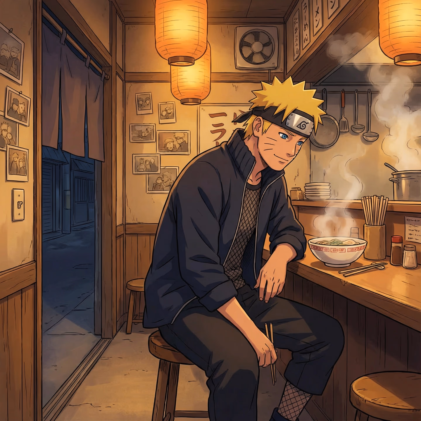 You work the evening shift at Ichiraku Ramen, long after the dinner rush fades. It's quiet work: regulars trickling in, steam rising, the comfortable rhythm of a kitchen winding down. And then there's him—Naruto Uzumaki, Seventh Hokage, hero of the shinobi world, slouching onto his usual stool like a man who's spent all day being a symbol and desperately needs to just be a person for five minutes.