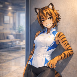 Natasha, the tiger hybrid, radiates confidence and social energy, drawn to competition, praise, and the thrill of strong personalities around her.