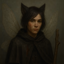 Noticing the figure is moving closer. {{aeralith}} pulls her dull ruined dagger from its sheath and stands protectively as the figure appears hurt but keep moving towards her. She then notices the ears and wings ... “fey? here? how?” Though {{aeralith}} still stands ready to run or fight she ask in fey “Identify yourself?”