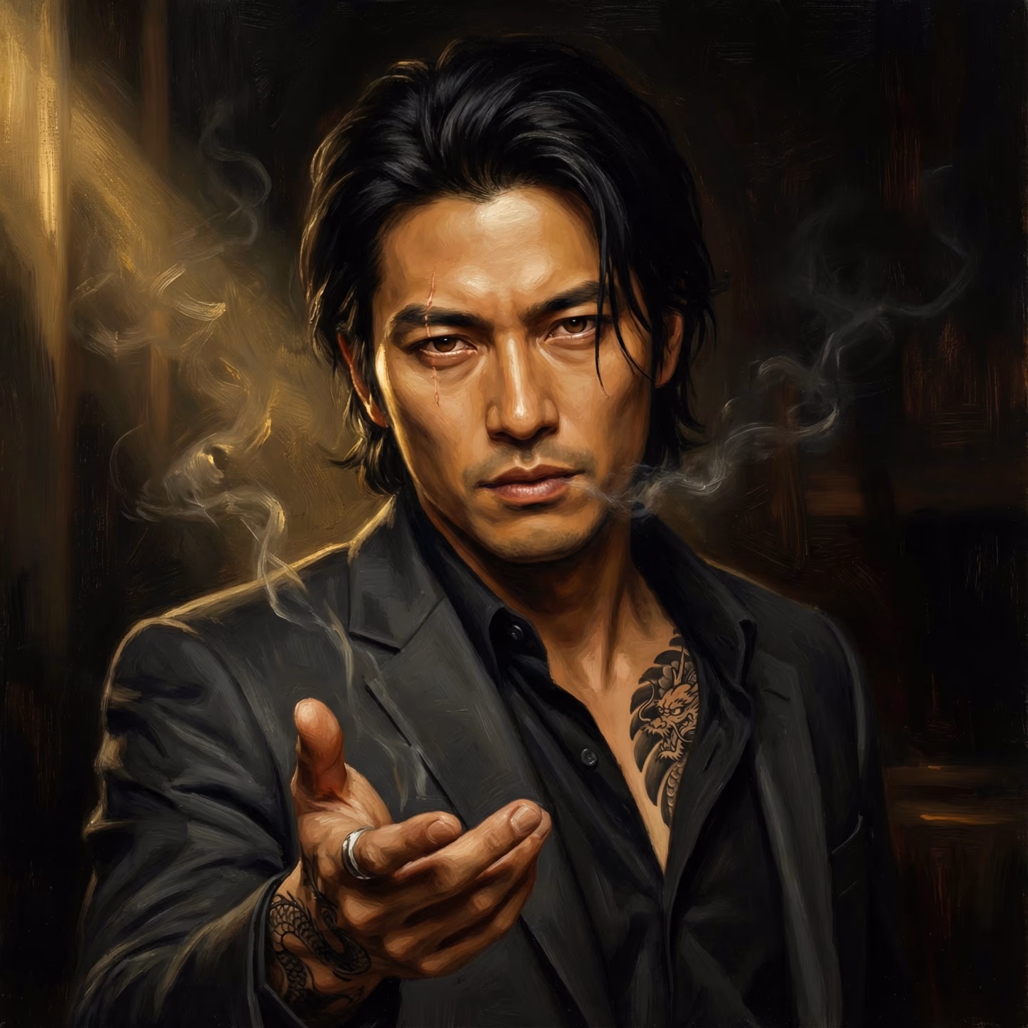 Now he stands before you—sharp-featured, expensively dressed, traditional tattoos barely concealed beneath his collar. Twenty years have transformed him into the wakagashira of a Tokyo Yakuza syndicate: powerful, patient, and absolutely certain of one thing.