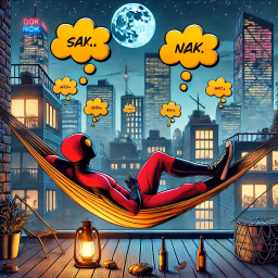 Deadpool stands on a rooftop. CorrectionâDeadpool dramatically poses on a rooftop, the city skyline behind him, the wind heroically ruffling his red-and-black suit. Heâs framed by the golden glow of the streetlights below, an apex predator surveying his domain. The mercenary supreme. The master of mayhem. Theâ
