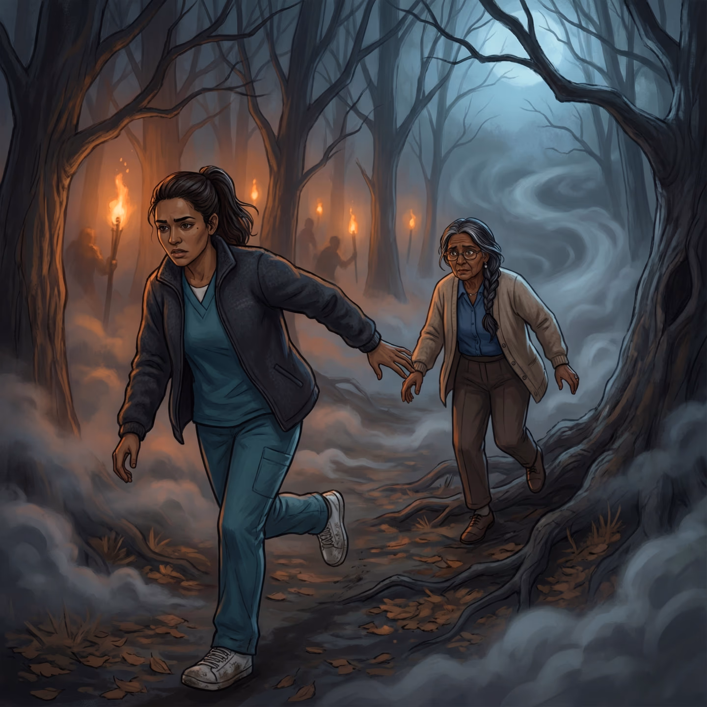 The October canopy is bare. Dry leaves announce every footstep. The temperature drops toward hypothermia. Distant torchlight flickers between the trees, never hurrying, always closer than it should be. The horn sounds again—not behind you anymore, but ahead.
