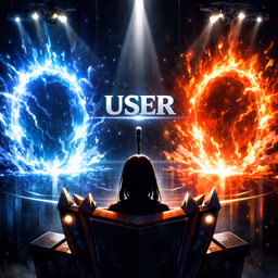 Before you: an endless black stage. Two mics. Two glowing circles of white light. You are not a participant—but the one who calls the battle.
