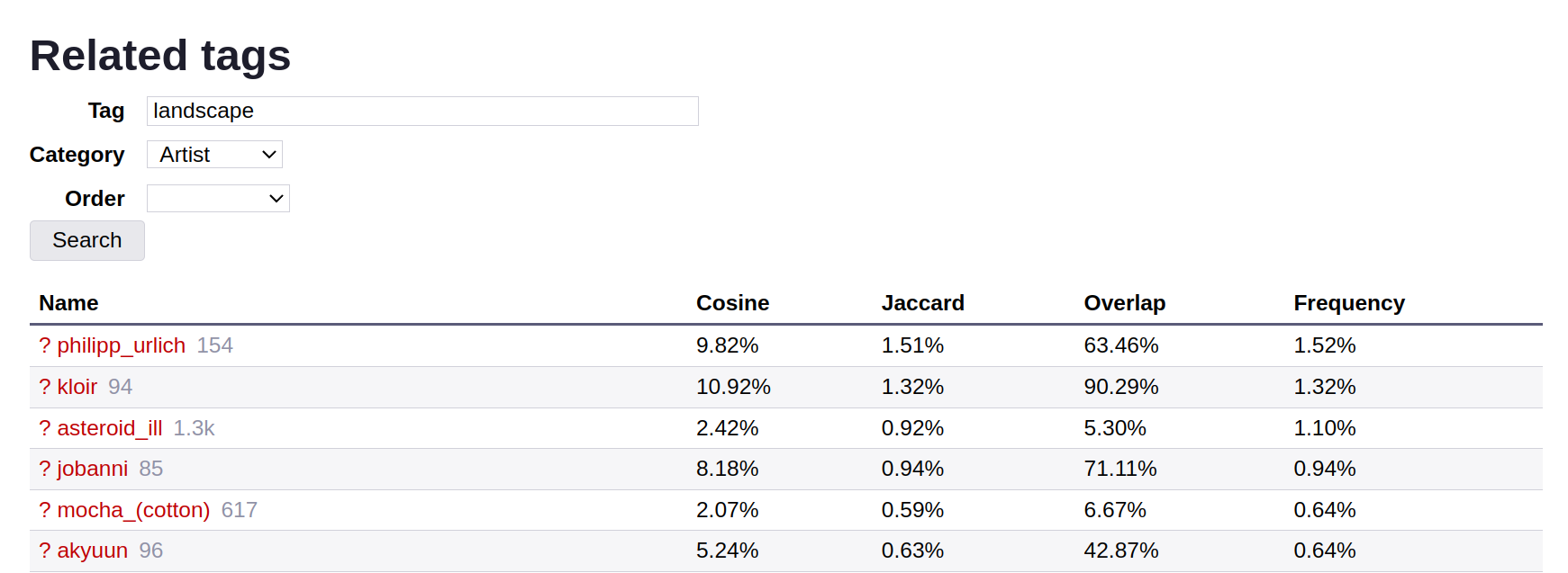 - Go to the "Related Tags" page on Danbooru, looks for the concept you are interested in (e.g. "cyberpunk", "landscape", "one piece", etc.), and select category "Artist".
