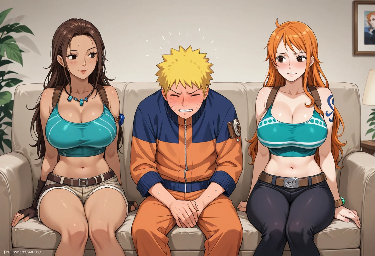 uzumaki naruto, lara croft and nami sitting on the sofa,